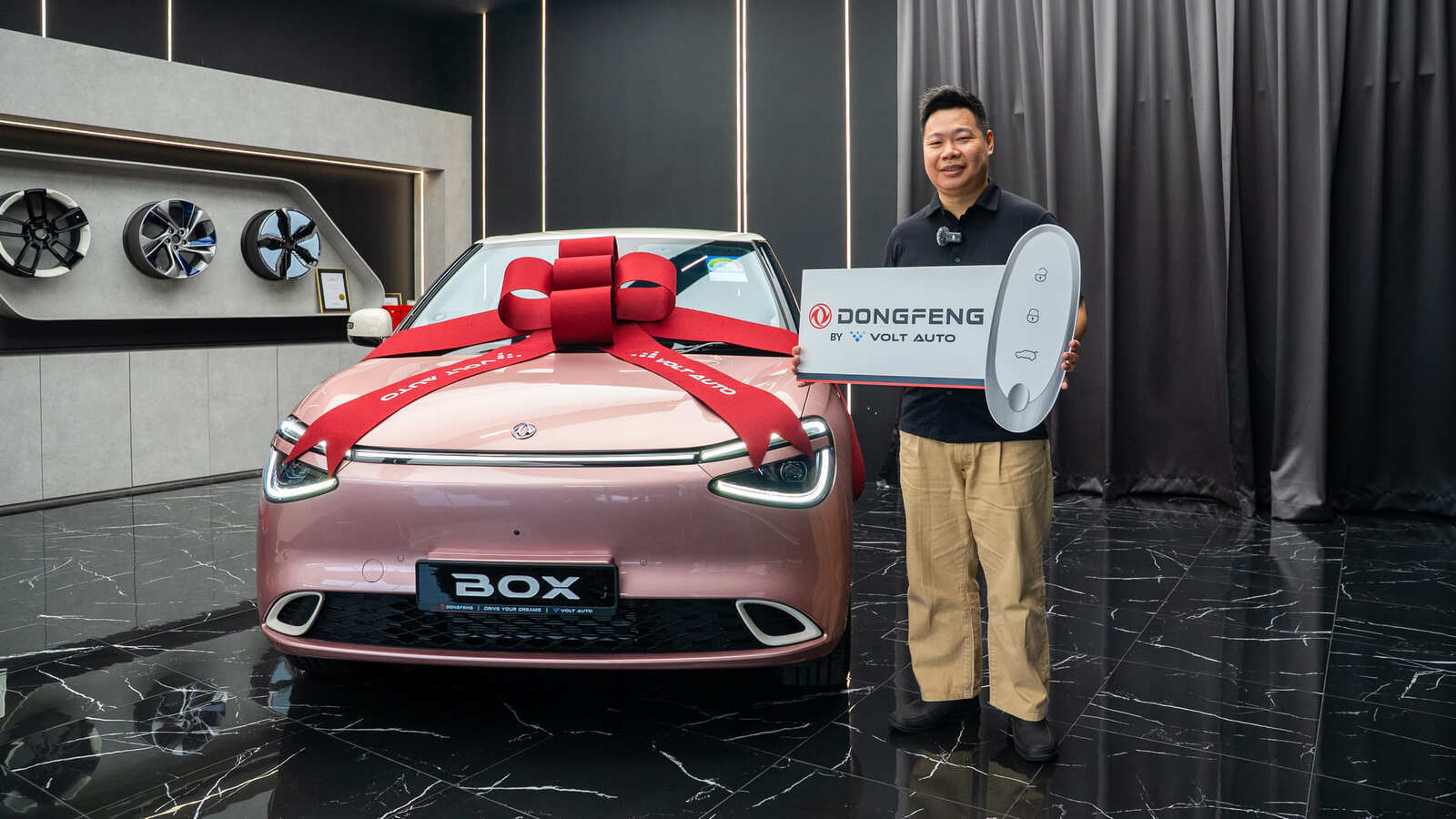 Mr Wong was in high spirits when he came to the Dongfeng showroom to receive his new car and eventually decided to upgrade from the Box he had originally won to the larger Dongfeng 007 electric sedan.